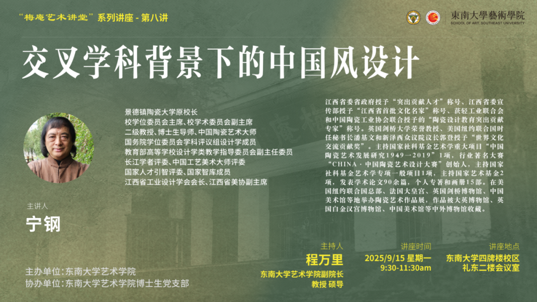 2025年9月15日上午,由东南大学艺术学院主办、博士生党支部承办的“梅庵艺术讲座”系列的第八次讲座在东南大学四牌楼校区礼东二楼会议室顺利完成。本次讲座邀请景德镇陶瓷大学原校长宁钢教授,以《交叉学科背景下的中国风设计》为题开展专题讲座,讲座由东南大学艺术学院副院长程万里主持,东南大学艺术学院党委书记赵天为、东南大学艺术学院副院长董甜甜、东南大学艺术学院教师曾伟、何盛、硕博研究生等参与讲座,并开展讨论。与此同时,讲座还吸引了众多校外专家学者共同参与,并获得社会层面的热烈反响。