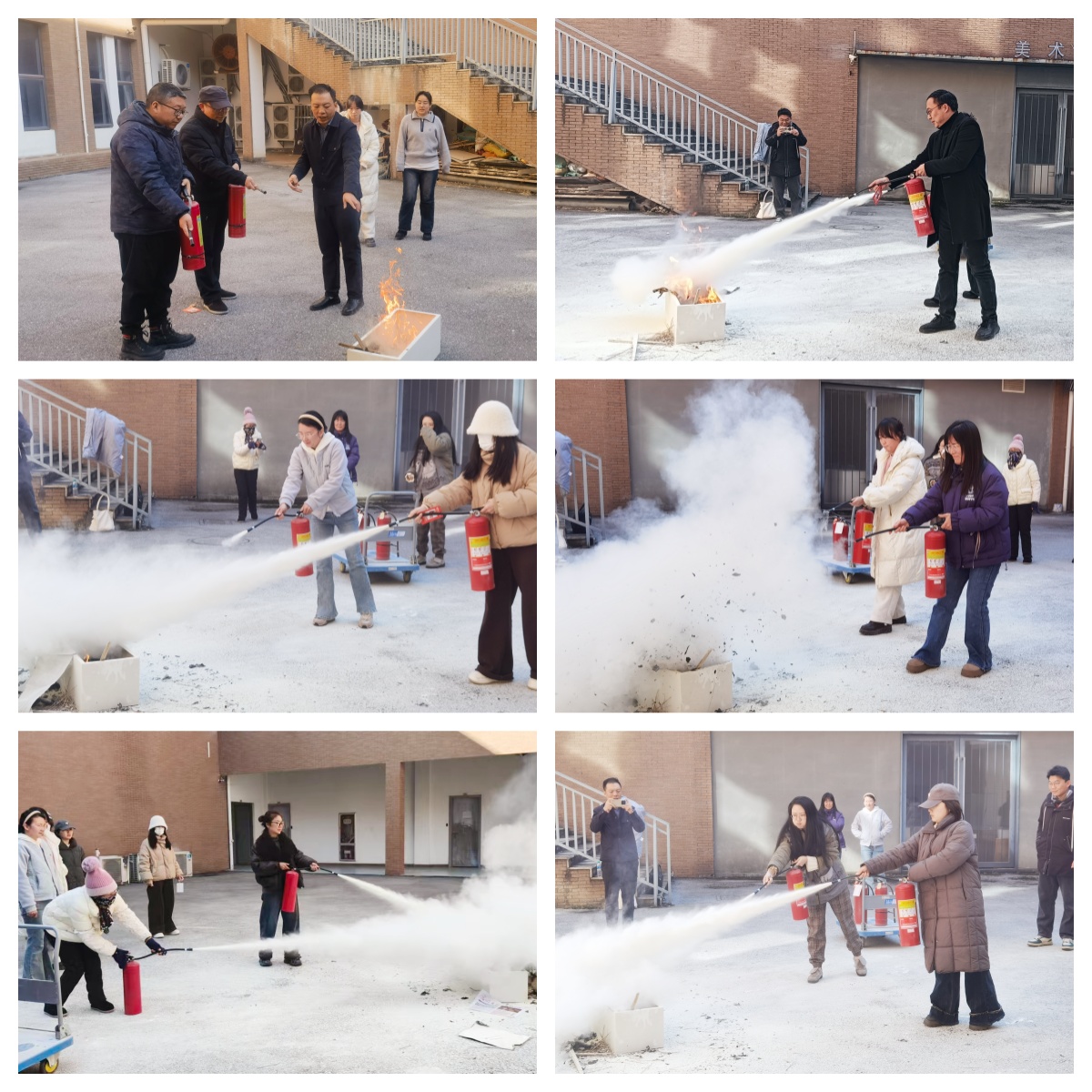 讲座结束后,消防安全演练在研究生艺术实验楼侧边露天区域正式启动。实操环节中,消防讲师现场讲解并示范灭火器正确使用方法及初期火灾扑救技巧,随后指导教职工代表进行实操练习。在讲师的专业指导下,大家顺利完成灭火器“提、拔、握、压”标准操作,切实掌握了基础灭火技能。